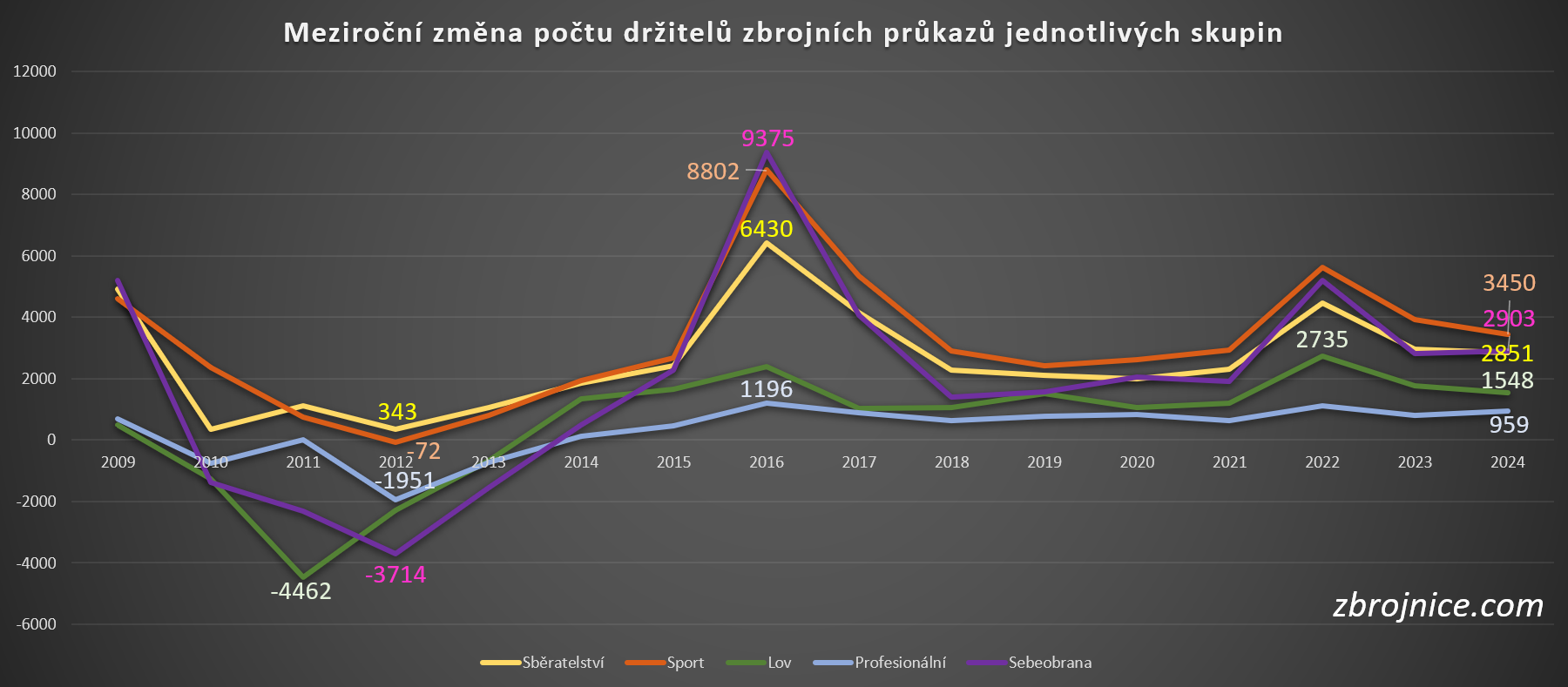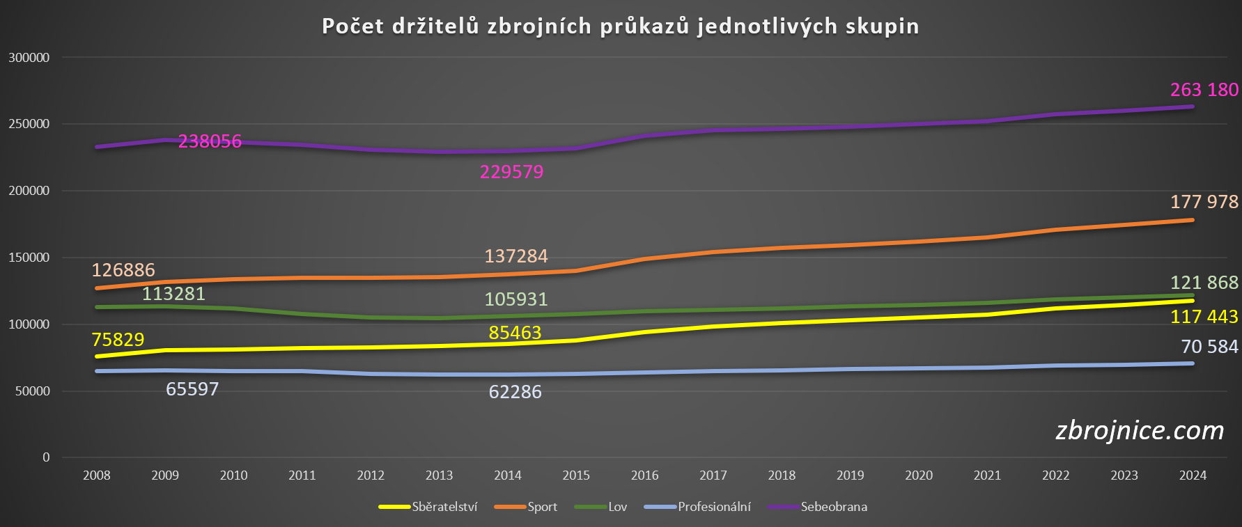 Ke konci roku 2024 bylo v České republice 319.559 držitelů zbrojních průkazů. Pokud bude zachován setrvalý nárůst počtu nových držitelů zbrojních průkazů, tak přibližně v srpnu 2025 bude překonán dosavadní rekord z roku 2001. Tehdy zbrojní průkaz drželo 321.215 osob, přičemž následně počet držitelů procházel pomalým ale setrvalým poklesem až do chvíle představení unijní zákazové zbraňové směrnice v roce 2015.