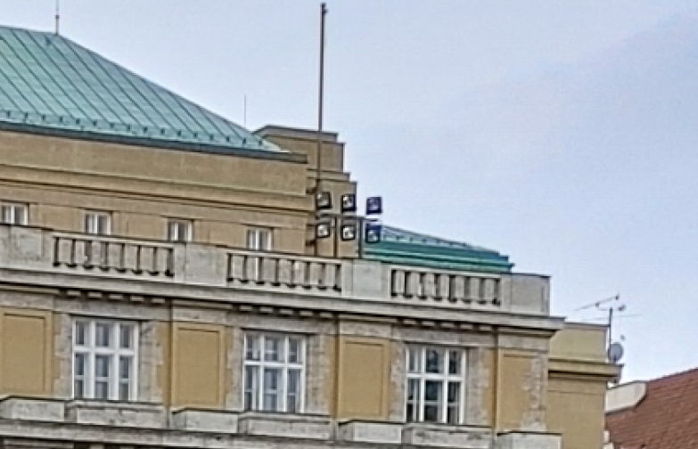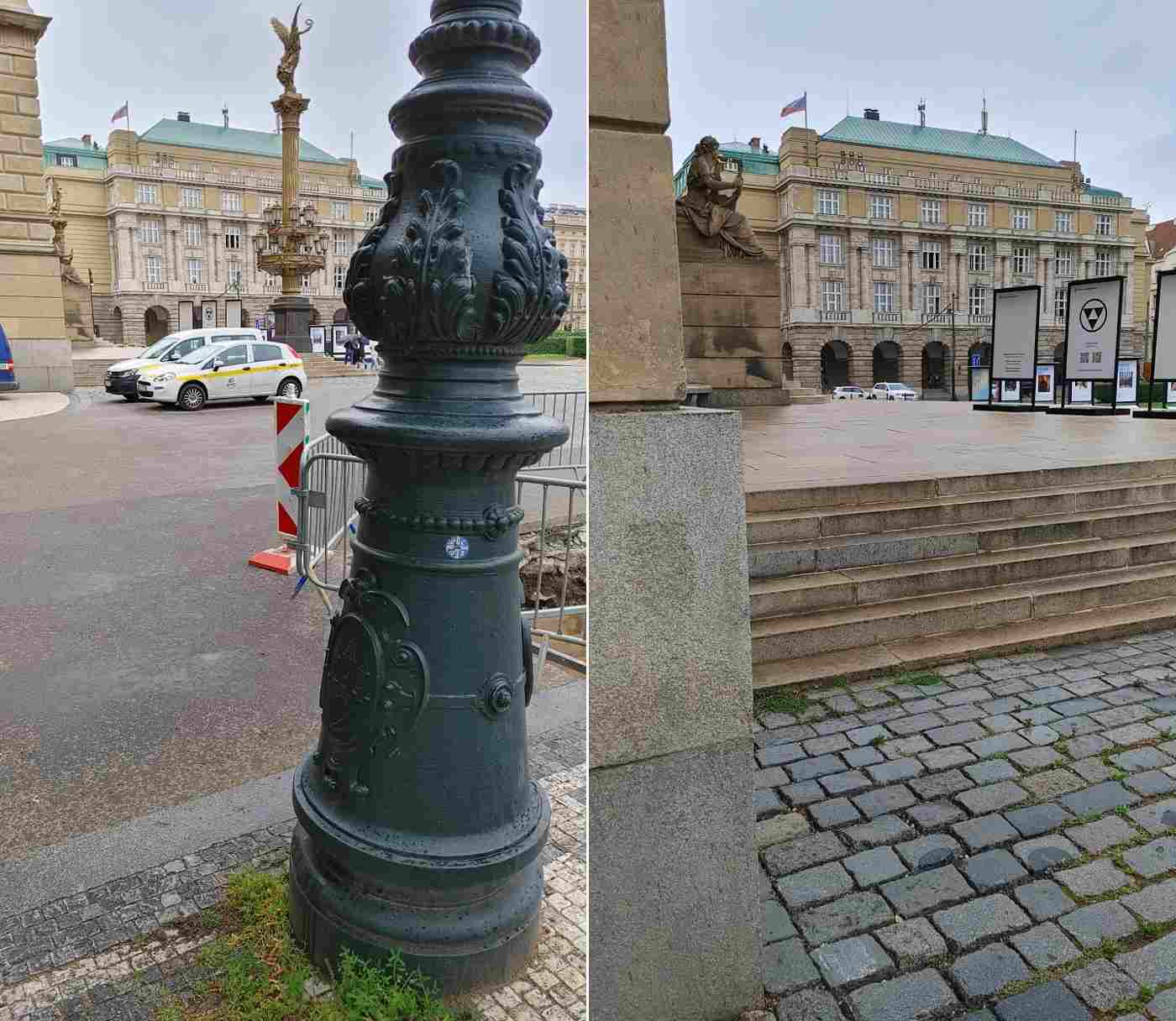 Vlevo: Lampa, za kterou se nprap. Jiří P. kryl před střelbou pachatele. Pachatel se v té chvíli nacházel v levé části ochozu (pod českou vlajkou). Vpravo: Roh, zpoza kterého po přesunu a krátké prodlevě nprap. Jiří P. opětoval palbu. Pachatel se v té chvíli nacházel v pravé části ochozu (pod prázdným vlajkovým stožárem, v době útoku nesoucím ukrajinskou vlajku).
